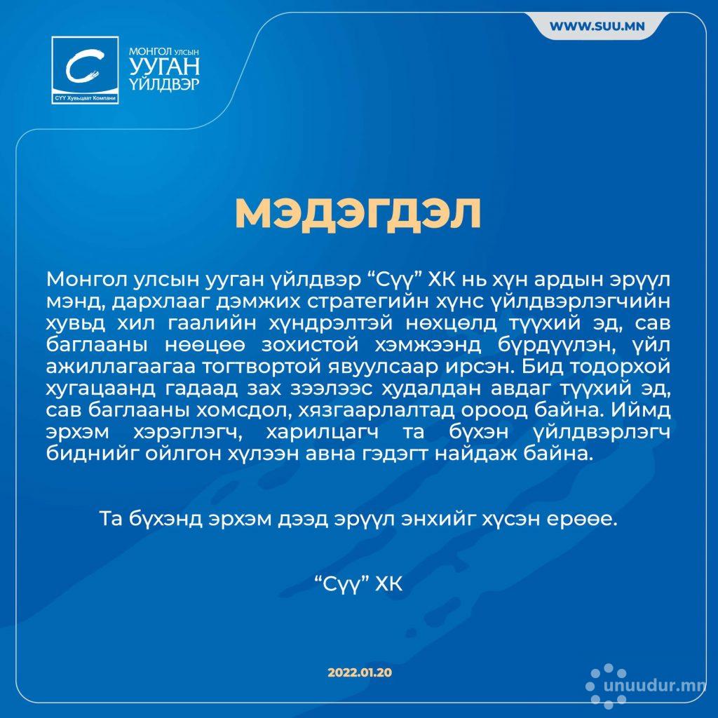 Монгол Улсын ууган үйлдвэр “Сүү” ХК нь хүн ардын эрүүл мэнд, дархлааг дэмжих стратегийн хүнс үйлдвэрлэгчийн хувьд хил гаалийн хүндрэлтэй нөхцөлд түүхий эд, сав баглааны нөөцөө зохистой хэмжээнд бүрдүүлэн, үйл ажиллагаагаа тогтвортой явуулсаар ирсэн. Бид тодорхой хугацаанд гадаад зах зээлээс худалдан авдаг түүхий эд, сав баглааны хомсдол, хязгаарлалтад ороод байна. Иймд эрх хэрэглэгч харилцагч та бүхэн үйлдвэрлэгч биднийг ойлгон хүлээн авна гэдэгт найдаж байна гэжээ.