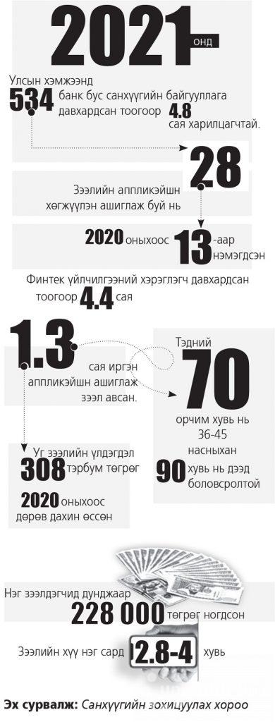 Зээлийн аппликэйшн бол ББСБ-уудын санал болгож буй нэг үйлчилгээ. Манай улсад ийм байгууллагуудын зээлийн хүүгийн дээд хязгаарыг тогтоох, ямар нэгэн зохицуулалт хийх хууль, журам байхгүйг Санхүүгийн зохицуулах хорооны Банк бус санхүүгийн газрын нэгэн мэргэжилтэн өгүүлэв. Тэрбээр “Финтек буюу санхүүгийн цахим үйлчилгээний орчинд тавих өндөр хяналт байхгүй гэдэгтэй санал нийлнэ. Өөрөөр хэлбэл, зээлийн хүү болон хугацааг нь зохицуулах журам, дүрэмгүй. Гэхдээ ББСБ-ууд л аппликэйшн хөгжүүлэх эрхтэй. Нэг талаас хэрэглэгч, нөгөө талаас үйлчилгээ байгаа учраас л финтек зээлийн хэмжээ өсөөд байгаа хэрэг. 2021 онд онлайнаар 1.3 сая гаруй иргэн зээл авсан нь ББСБ-ын зээлдэгчийн 80.4 хувь нь гэдгийг статистикаас харж болно. Ийм өргөн хүрээг хамарч буй учраас зарим компани зөвшөөрөл авалгүй үйл ажиллагаа эрхэлж байсан. Тиймээс өнгөрсөн жил 15 аппликэйшнийг хаалгасан” гэсэн юм