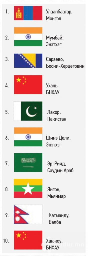 НҮБ-ын “Хабитат”, “Грийнпийс”, Байгаль орчны хөтөлбөрийн түншлэлийн хүрээнд бий болгосон iqair.com цахим хуудсанд мэдээлснээс үзвэл манай нийслэл агаарын бохирдлоороо 89 хотыг ардаа орхижээ. Улаанбаатарт агаар бохирдуулагч гол эх үүсвэрүүдийн нэг нарийн ширхэгт тоосонцрын хэмжээ их байгаа нь ийнхүү тэргүүлэхэд хүргэсэн гэнэ. Тус цахим хуудсаар дамжуулан дэлхийн агаарын чанарын мэдээллийг олон нийтэд тогтмол хүргэдэг бөгөөд бохирдлын түвшнээр нь жагсаадаг. Улаанбаатарын дараа буюу хоёрдугаарт Энэтхэгийн Мумбай, гуравт Босни-Херцеговины Сараево хот бичигджээ.