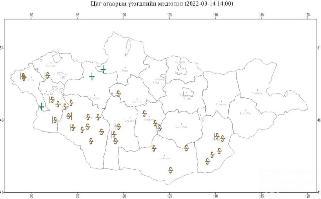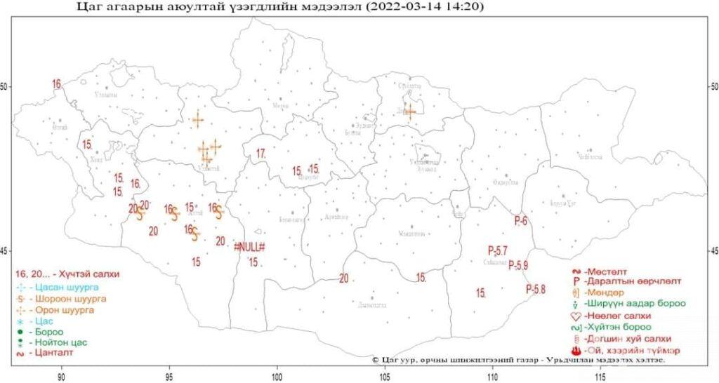 Өнөөдөр 14 цагийн байдлаар Ховд, Говь-Алтай, Баянхонгор аймгийн ихэнх сумдын нутаг Архангай, Өвөрхангай, Өмнөговь, Дорноговь аймгийн зарим сумдын нутгаар салхины хурд 15-20 м/с, зарим үед 24-26 м/с хүрч хүчтэй салхилан шороон шуурга шуурч байна. Хүчтэй салхи, шороон шуурганы аюулаас анхаарал болгоомжтой байхыг ЦУОШГ-аас онцгойлон анхаарууллаа.