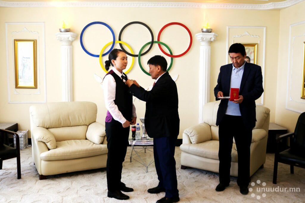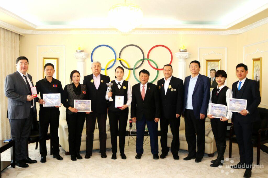 Сүүлийн үед амжилт арвин байгаа бильярдын тамирчид болон холбооны төлөөллийг МҮОХ-ны Ерөнхийлөгчийн үүрэг гүйцэтгэгч Ч.Наранбаатар өнөөдөр хүлээн авч уулзан баяр хүргэж, МҮОХ-ны шагналаар шагнаж урамшууллаа. Тухайлбал, Монголын бильярдын холбооны ерөнхийлөгч Б.Мандахбаяр, Монголын бильярдын холбоог үүсгэн байгуулагч, холбооны Удирдах зөвлөлийн гишүүн М.Мягмаржав, Д.Амаржаргал нарыг МҮОХ-ны “Алтан очир” одонгоор, тамирчин Б.Нарантуяаг “Олимпын алдар” одонгоор шагналаа.