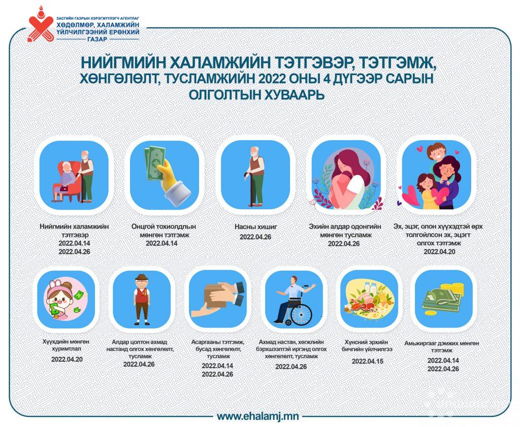 Хуваарь ёсоор нийгмийн халамжийн тэтгэвэр, онцгой тохиолдлын мөнгөн тэтгэмж, асаргааны тэтгэмж болон бусад хөнгөлөлт, тусламжийн мөнгийг дөрөвдүгээр сарын 14-нөөс олгох бол өрх толгойлсон эцэг, эхийн тэтгэмж, хүүхдийн мөнгийг 20-ноос өгч эхлэх гэнэ. Харин ахмадуудад өгдөг насны хишиг, эхийн алдар одонгийн мөнгийг дөрөвдүгээр сарын 26-нд олгох юм байна.