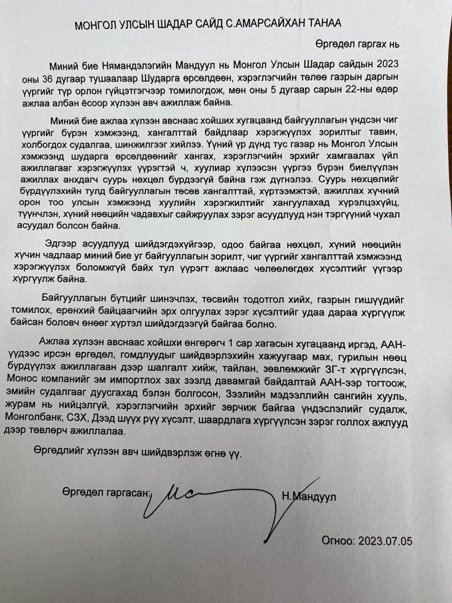 ШӨХТГ-ын дарга Н.Мандуул Монгол Улсын Шадар сайдад ажлаас чөлөөлөгдөх өргөдөлөө долдугаар сарын 5-ны өдөр өгсөн байна. Тэрбээр өргөдөлдөө “Ажлаа хүлээн авснаас хойших хугацаанд байгууллагын үндсэн чиг үүргийг бүрэн хэмжээнд хангалттай байдлаар хэрэгжүүлэх зорилт тавин, холбогдох судалгаа шинжилгээг хийлээ. Үүний үр дүнд тус газар нь Монгол Улсын хэмжээнд шударга өрсөлдөөнийг хангах, хэрэглэгчийн эрхийг хамгаалах ажлыг хийх үүрэгтэй ч хуулиар хүлээсэн үүргээ бүрэн биелүүлэн ажиллах анхдагч суурь нөхцөл бүрдээгүй байна гэж дүгнэлээ. Байгууллагын бүтцийг шинэчлэх, төсвийн тодотгол хийх, газрын гишүүдийг томилох, ерөнхий байцаагчийн эрх олгох зэрэг хүсэлтийг удаа дараа хүргүүлж байсан боловч өнөөг хүртэл шийдэгдээгүй байгаа болно. Иймд миний бие цаашид үйл ажиллагааг хэрэгжүүлэх боломжгүй тул үүрэгт ажлаас чөлөөлөгдөх хүсэлтийг хүргүүлж байна" гэдгээ дурдсан байна.