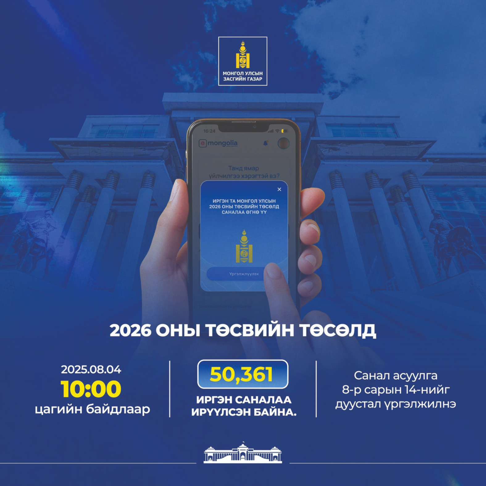 2026 оны төсвийн төсөлд иргэдээс санал авах мэдээллийг Г.Занданшатарын Засгийн газар өргөн хүрээнд тарааснаараа л шинэлэг сонсогдсон байх нь. Ийнхүү иргэдээсээ асууж буй гурав дахь жилийн төсөвт “И-Монголиа” аппликэйшн болон 11-11 төв, яамдын цахим хуудсаар дамжуулан саналаа өгч болно. Мөн өчигдөр эхний танхимын хэлэлцүүлгийг зохион байгуулж, уул уурхай, хүнд үйлдвэр, барилга, зам, тээвэр, эрчим хүч, цахим хөгжил, харилцаа холбооны салбарын төсвийн асуудлаар санал сонссон байна. Өнөөдөр Соёл, спорт,аялал жуулчлал, залуучуудын яаманд дараагийн хэлэлцүүлгийг хийнэ. Энэ сарын 14-нийг дуустал яамдад нийт 12 удаа ийм хэлэлцүүлэг өрнүүлэх юм билээ.