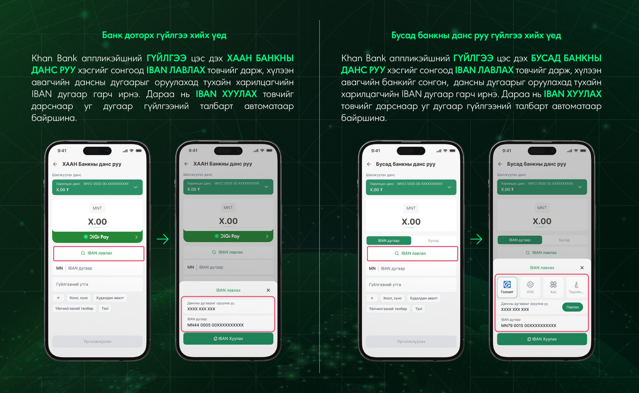 Одоо та Khan Bank аппликэйшнээр данс хооронд болон бусад банк руу гүйлгээ хийхдээ 20 оронтой IBAN дансны дугаарыг заавал асуух шаардлагагүй. Товчхондоо бол “Гүйлгээ” цэс дэх гүйлгээний төрлөө сонгоод “IBAN лавлах” товчийг дарж, хүлээн авагчийн дансны дугаарыг оруулахад тухайн харилцагчийн IBAN дугаар гарч ирнэ. Дараа нь “IBAN хуулах” товчийг дарснаар уг дугаар гүйлгээний талбарт автоматаар байрших бөгөөд баталгаажуулснаар гүйлгээ амжилттай хийгдэнэ.