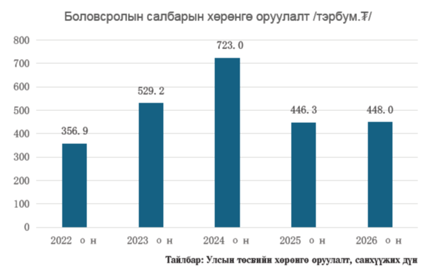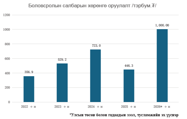2028 он хүртэл 95 цэцэрлэг, 108 сургууль шинээр барьж, шаардлагатай тоног төхөөрөмж, хэрэглэгдэхүүнийг хангах ажлыг үе шаттайгаар хэрэгжүүлэхээр төлөвлөж, улсын төсвийн хөрөнгө оруулалтаар 448, гадаадын зээл тус ламжаар 593.6 тэрбум буюу нийт нэг их наяд төгрөгийг 2026 оны төсвийн төсөлд тусгалаа. Энэ нь 2025 оны төсөвтэй харьцуулахад 2.3 дахин нэмэгдсэн дүн юм.
