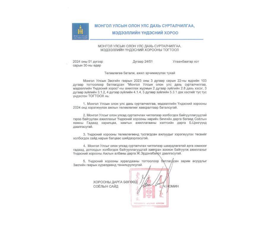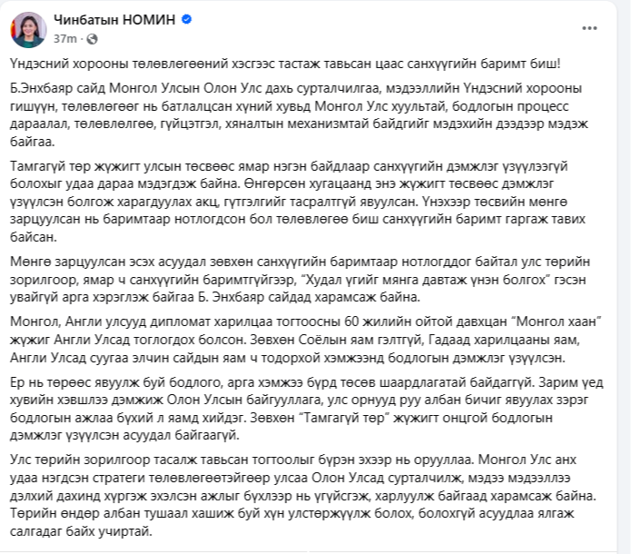 Улс төрийн зорилгоор тасалж тавьсан тогтоолыг бүрэн эхээр нь орууллаа. Монгол Улс анх удаа нэгдсэн стратеги төлөвлөгөөтэйгөөр улсаа Олон Улсад сурталчилж, мэдээ мэдээллээ дэлхий дахинд хүргэж эхэлсэн ажлыг бүхлээр нь үгүйсгэж, харлуулж байгаад харамсаж байна. Төрийн өндөр албан тушаал хашиж буй хүн улстөржүүлж болох, болохгүй асуудлаа ялгаж салгадаг байх учиртай" хэмээн бичээд дараах баримыг оруулжээ.