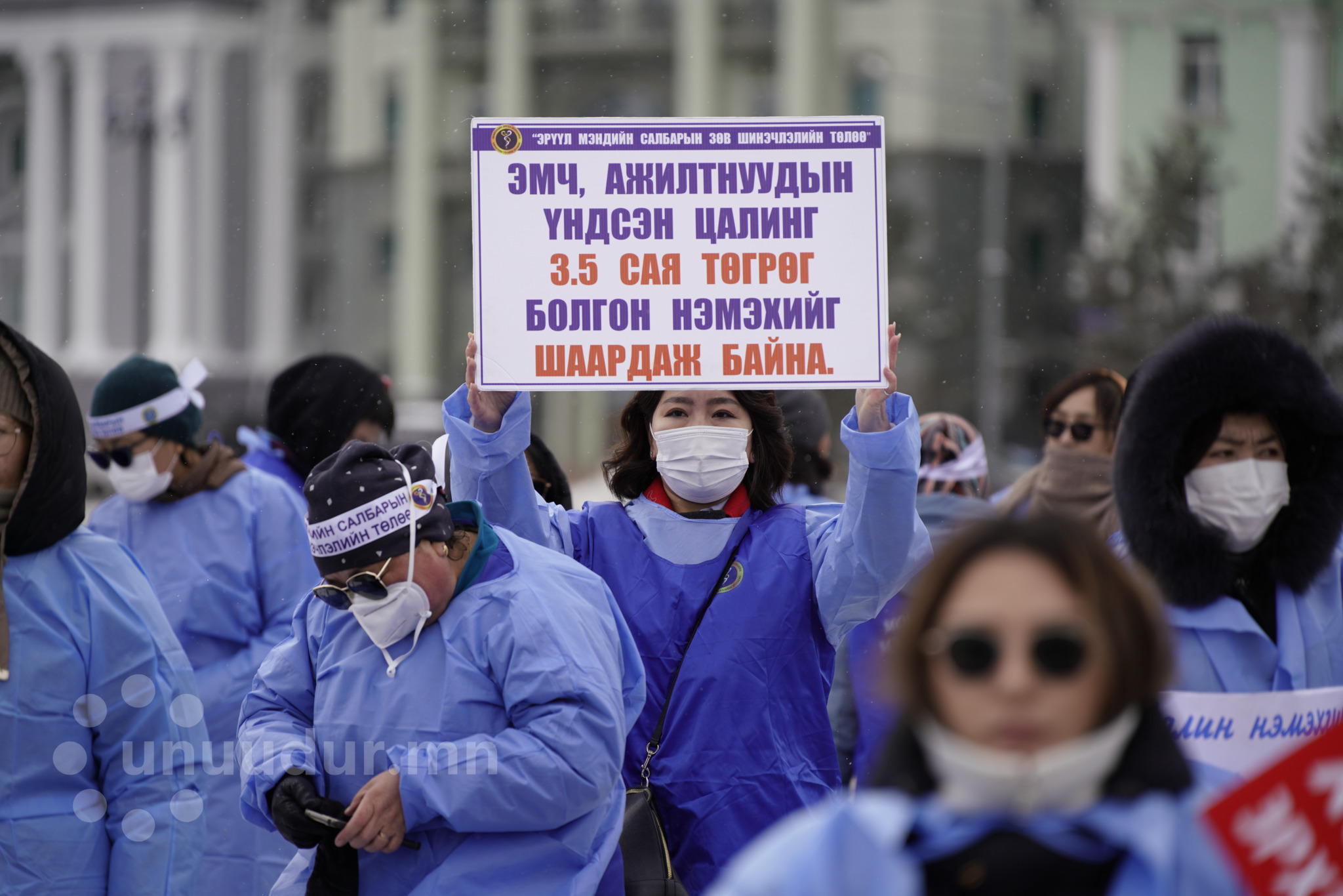 Ирэх онд салбарынхны цалинг 10-15 хувиар нэмэгдүүлэхээр төсөвт санхүүжилтийг нь тусгасан байж. Харин энэ нь эмч, ажилчдад огт таалагдаагүй. Монголын үйлдвэрчний эвлэлийн холбоо (МҮЭХ)-ынхон ч төр төмөр нүүрээ эрүүл мэндийн салбарынханд харуулж буй гэсэн байр суурьтай байна. Тус холбооны ерөнхийлөгч Э.Тамир “Эмч, эмнэлгийн ажилтнууд эцсээ хүртэл хэлэлцээр хийж, үр дүнд хүрэхийг хүлээлээ. Гэвч нааштайгаар юу ч шийдэгдсэнгүй. Харин тэднийг ажил хаяж, жагсаал, цуглаан зохион байгуулах үеэр хүний амь нас, эрүүл мэндэд ямар нэгэн эрсдэл учирвал хариуцлагыг нь төр хүлээнэ шүү. Тиймдээ ч УИХ, Засгийн газар эрүүл мэндийн салбарын олон мянган ажилчныг үл тоож байгаа биз. Өнгөрсөн баасан гараг (арваннэгдүгээр сарын 7)-т сайд Ж.Чинбүрэнг бидэнтэй уулзаж, тодорхой шийдэлд хүрэх болов уу хэмээгээд товлосон цагтаа хүлээсэн боловч ирсэнгүй.