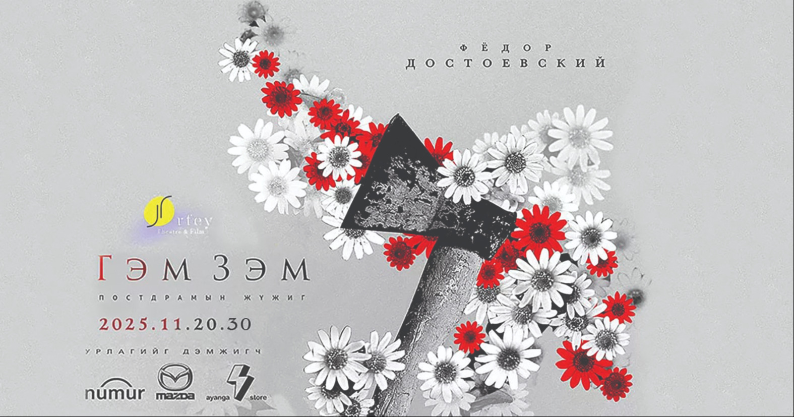 “Орфей” театрынхан Ф.М Достоевскийн хамгийн алдартай роман болох “Гэм зэм”-ийг Монголын тайзнаа дахин амилуулах нь. Тэд “Гэм зэм” постдрамын жүжгийг Тусгаар тогтнолын ордны тайзнаа энэ сарын 20-нд толилуулах бөгөөд тасалбарыг 50-70 мянган төгрөгөөр борлуулж байна. Эл жүжигт хүний үйлдэл, түүнээс гарах үр дагавар, эгэл жирийн харилцаанаас эхлээд хууль, цаазын өмнө бие хүн хэрхэн хувьсаж, тэмцэж буй тухай өгүүлнэ. Мөн хүний амьдралыг ойлгох цор ганц арга зам нь хайр, хайрыг мэдэрсэн хүний сэтгэлд л нигүүлслийн гэгээ тусах боломжтой талаар харуулах гэнэ. Тэгвэл Ф.М Достоевскийн хүн төрөлхтөнд хэлэхийг зорьсон энэ амин санааг “Орфей” театрынхан жүжгээрээ дамжуулан хүргэхийг хичээсэн аж.