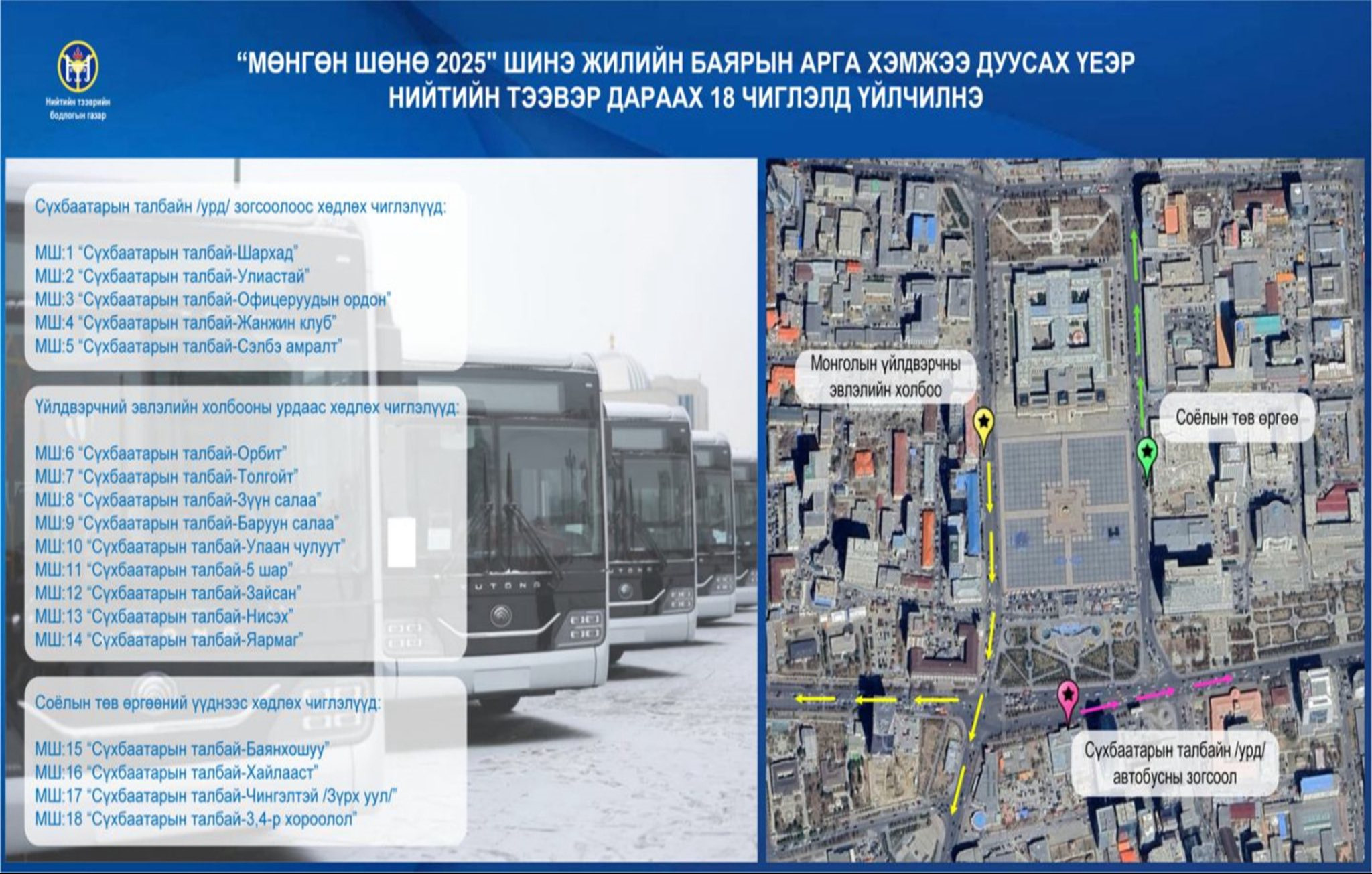 Нийслэлийн шинэ жилийн баярын үйл ажиллагааг зохион байгуулах ажлын хүрээнд 2025 оны 12 дугаар сарын 31-ний өдөр төв талбайд “Улаанбаатарын мөнгөн шөнө-2025” шоу тоглолт болно.