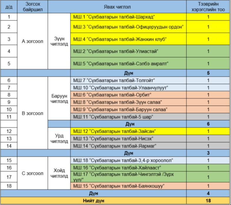 Тоглолтын дараа 18 чиглэлд их багтаамжийн 18 автобус Д.Сүхбаатарын талбайн баруун, зүүн болон урд зогсоол буюу зурагт тэмдэглэсэн “А”, “B”, “С” зогсоолоос суурьшлын цэгүүд рүү үнэ төлбөргүй үйлчлэхээр төлөвлөөд байна.