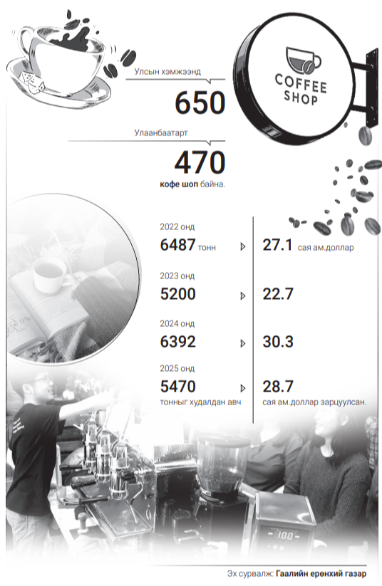 Шинэ өглөө эхэлмэгц айлууд цайгаа чанадаг байсан бол өдгөө усаа буцалгадаг, улмаар кофе чанадаг болсон гэхэд хилсдэхгүй. Монголчуудын хувьд цайны өндөр соёлтой гэгдэж байсан бол дараагаар нь шар айрагных (соёл гэдгийг хэрэглээ гэж ойлгож болно) нэвтэрч, өдгөө кофены соёл тэдгээрээс дутахгүй түгсэн хэмээн “Маркетингийн холбоо”-ноос 2024 онд гаргасан судалгаанд дурджээ. Үнэхээр л Улаанбаатарт хаа сайгүй кофе шоп үүдээ нээн, түүгээр үйлчлүүлэгчдийн тоо өссөн нь анзаарагддаг. Мөн тэдгээр кофе шоп нь интернэт орчин бүрдүүлж, заримд нь ном, сэтгүүл унших боломж олгосноороо залуучууд, хүүхдүүдийн цагаа өнгөрүүлэх нэгээхэн талбар болжээ. Үүнээс улбаалан кофены хэрэглээ, арилжаа, үнэ, зах зээлийн төлөв ямар байгааг сонирхлоо.