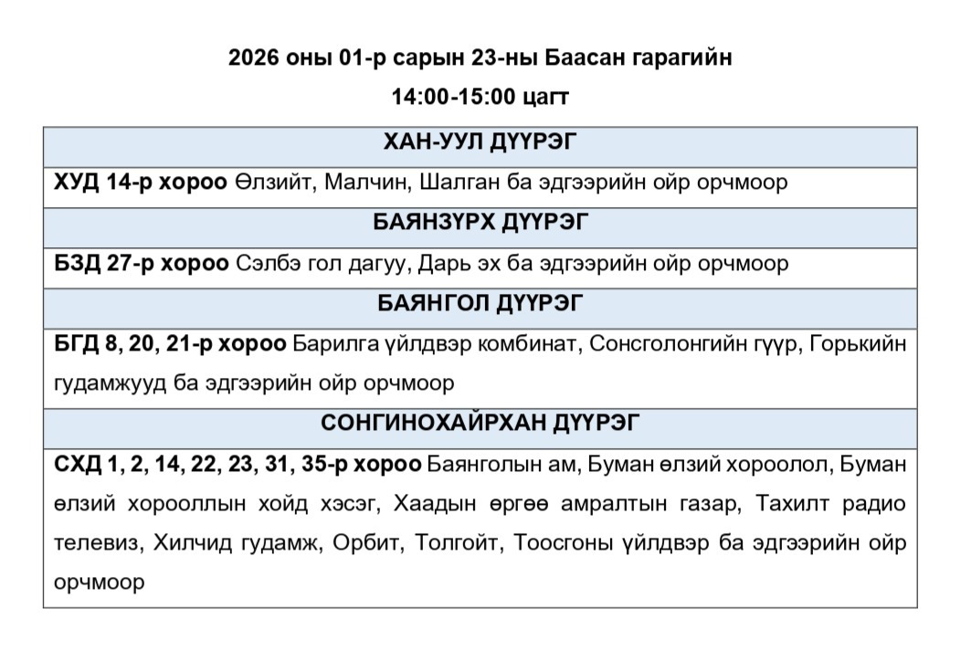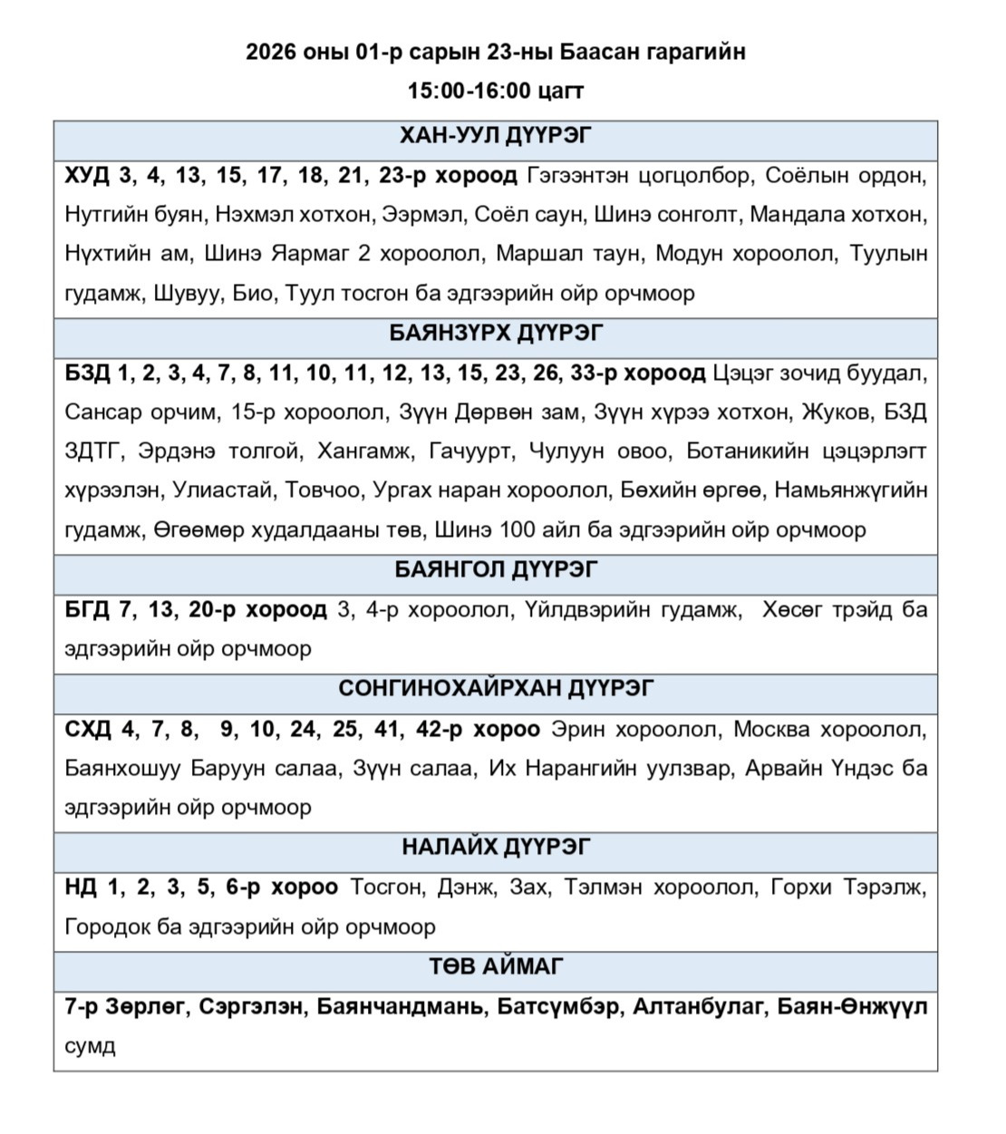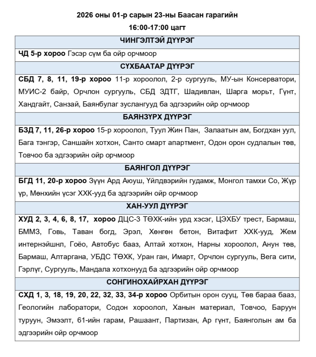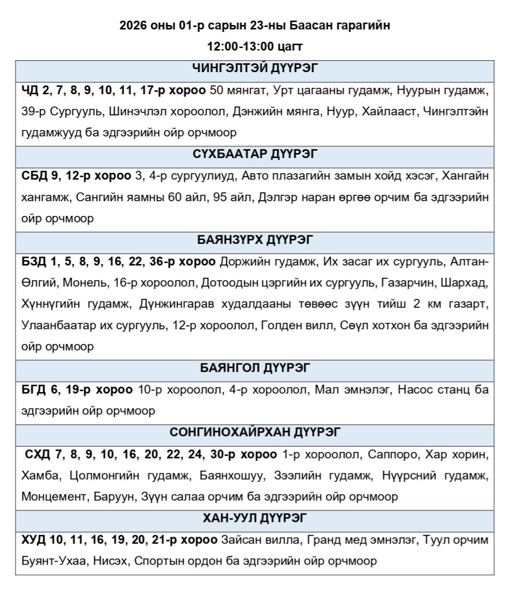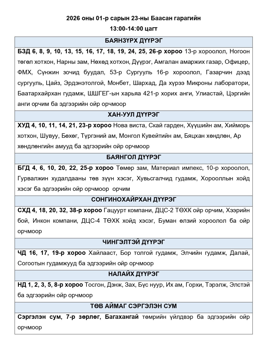 Эрчим хүчний чадлын дутагдлаас шалтгаалан 2026 оны 01-р сарын 23-ны Баасан гарагт цахилгаан эрчим хүчний “ХЯЗГААРЛАЛТ ХИЙЖ БОЛЗОШГҮЙ” байршлуудын хуваарь гарчээ.
