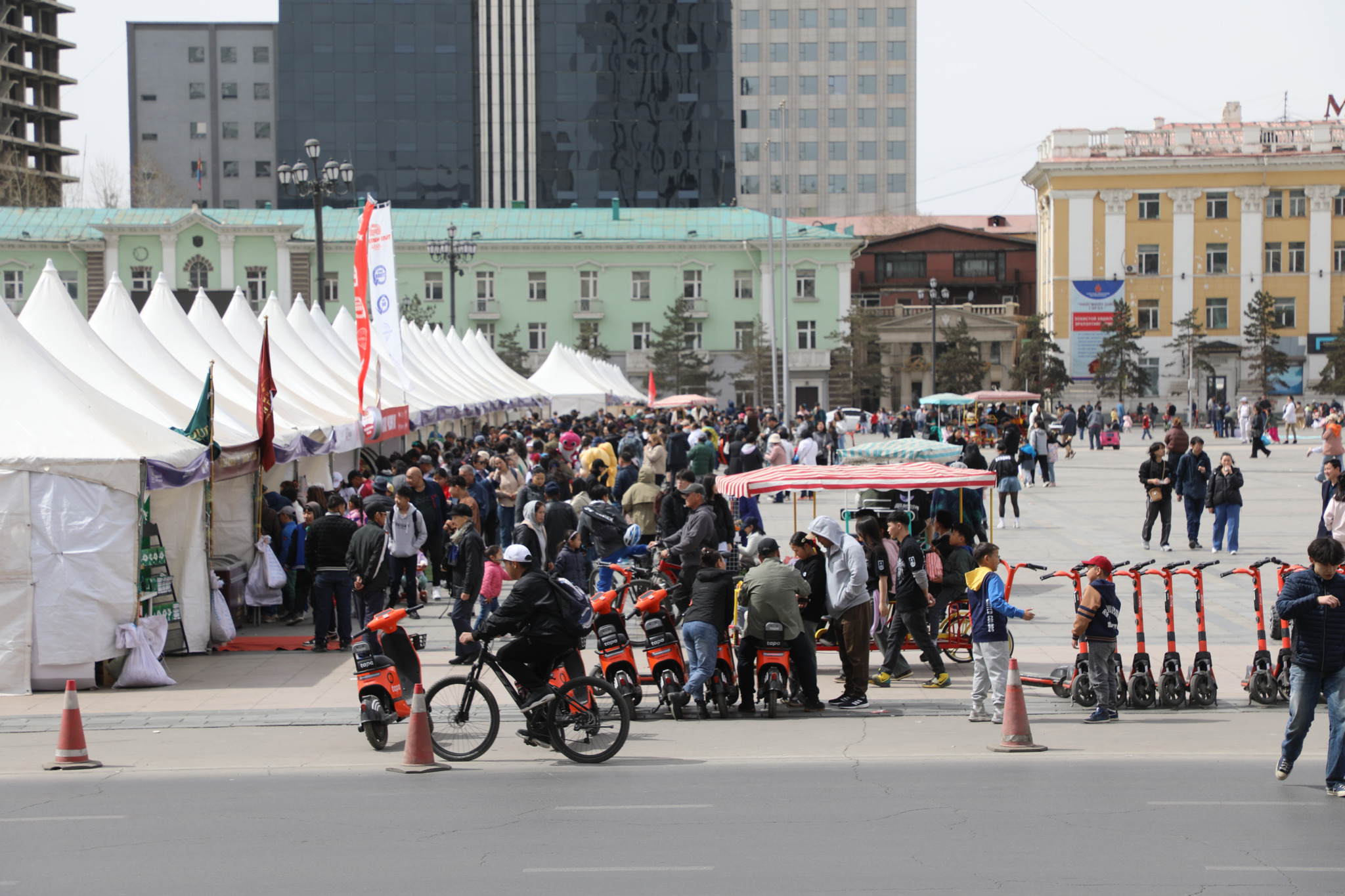 Сүхбаатарын талбайн урд хэсэгт өнгө өнгийн олон дугуй эгнүүлэн тавьсан байх бөгөөд суудлынх нь тооноос хамаараад 30-60 минутад 5-10 мянган төгрөгөөр түрээсэлдэг юм билээ. Зургаан хүний суудалтай том дугуйг 30 минут унахад 10 000, дөрвөн хүнийх нь 5000. Харин нэг хүний дугуйг 40 минут унахад 5000 төгрөгийн үнэтэй. Ийнхүү урин дулааны улирал эхлэхтэй зэрэгцэн төв талбайдаа дугуй түрээслүүлдэг нь олон хүний шүүмжлэл дагуулах болсон. Ялангуяа жуулчид, гадаадын иргэд үүнийг хараад нүд нь орой дээрээ гарах шахдаг юм билээ. Үнэхээр ч төв талбайнхаа урд бичил зах үүсгэж, түрээсийн дугуй унуулдаг газар манайхаас өөр хаана ч үгүй байх. Францчууд парламентын ордныхоо гадна асар барьчхаад, хоол хийж, спортын наадам зохион байгуулж байна гээд та төсөөлөөд үз дээ. Соёл иргэншилт ертөнцөд энэ бол төсөөлөхийн аргагүй галзуурал биз дээ. Харин Монголд, тэр дундаа Улаанбаатарт энэ бол жирийн л үзэгдэл мэт болж, бид ийм гаж байдалд хэдийн дасчихжээ.