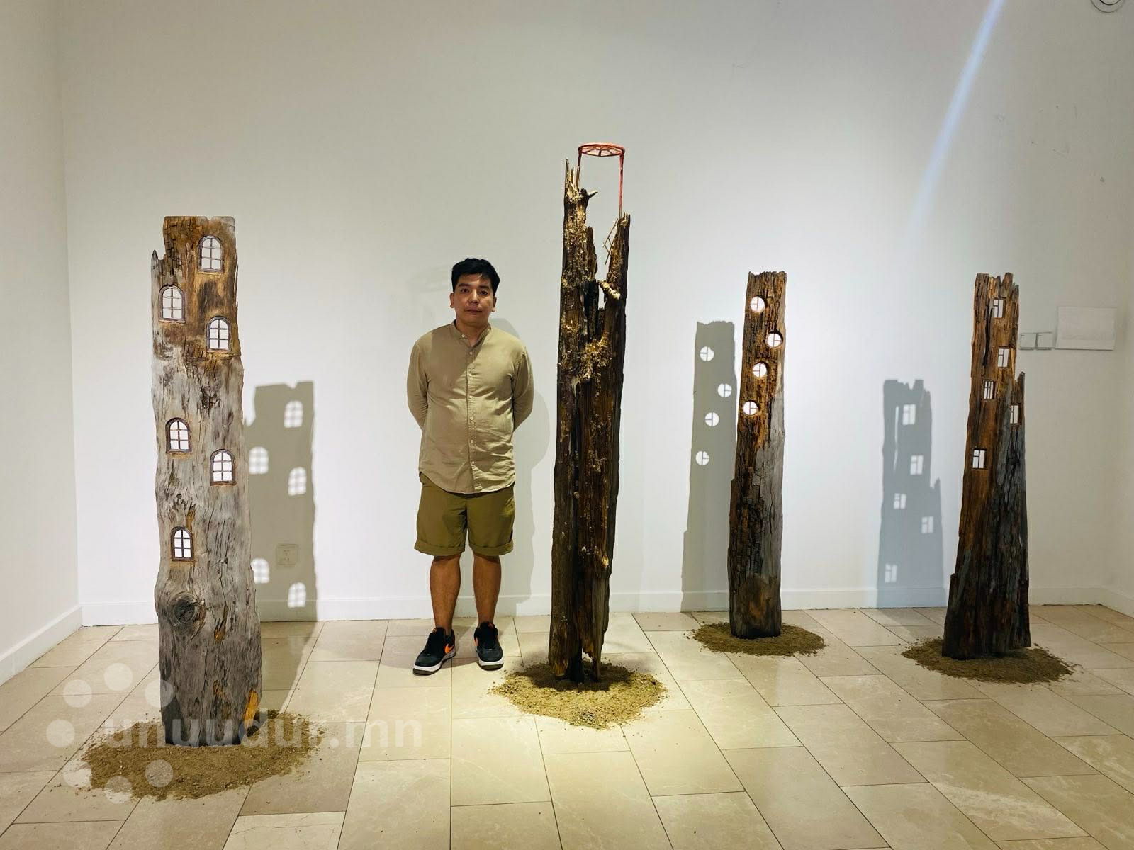 -Мөн л аавтай минь салшгүй холбоотой. Манай аав голчлон модоор сийлбэр хийдэг байлаа. Металл материал хүрэхэд хүйтэн мэдрэмж төрүүлдэг бол мод маш дулаахан. Хэдийгээр насжилтын хувьд керамикийг гүйцэхгүй ч хүн төрөлхтний түүхтэй салшгүй холбоотой, бидний хамгийн анхны бөгөөд үндсэн материал бол мод. Үүнээс гадна цементийг түгээмэл ашигладаг. Тухайн бүтээлийн онцлогоос шалтгаалж материалаа сонгодог. Тухайлбал, “Амь” үзэсгэлэнд дэлгэсэн зүрх, уушги зэрэг бүтээлээ ус, агаар нэвтэрдэггүй даавуугаар урласан.