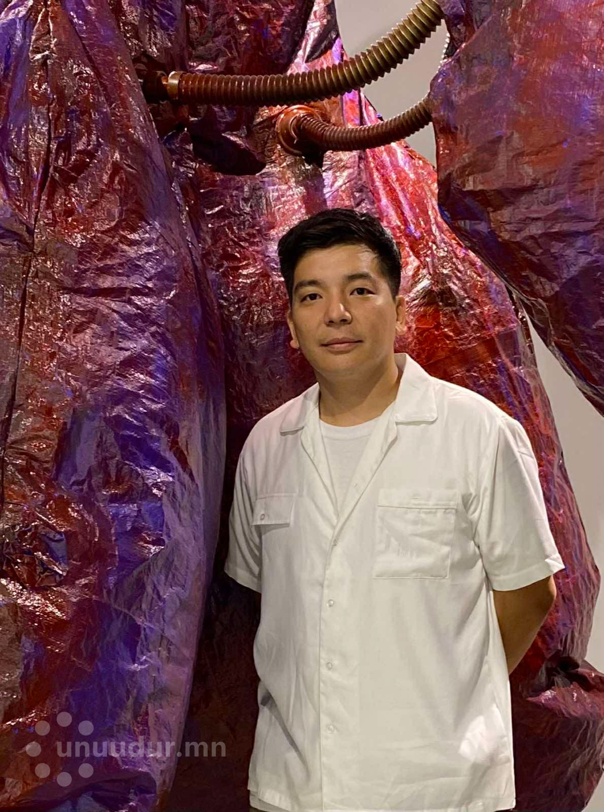 -Миний хувьд уран баримлын үзэсгэлэн гэхээр хүмүүсийн төсөөлдөг шиг заавал ямар нэг суурин дээр байрлуулсан, хөдөлгөөнгүй биет байх албагүй гэж бодсон л доо. Харин ч бүтээл маань хөдөлдөг, “амьсгалдаг” байвал үзэгчидтэй илүү нэгдэж, миний илэрхийлэхийг хүссэн conceptual art буюу буюу үзэл санааны урлагийг бүрэн дүүрэн хүргэж чадна гэж үзсэн юм. Өнөө цагт урлагийн хөгжил зураач зөвхөн зураг зурж, барималч баримлаа л урладаг гэх хязгаарлагдмал хүрээнээс хэдийн хальжээ. Контемпорари буюу нэн орчин үеийн урлагт тухайн хүний суурь мэргэжил барималч, эсвэл зураач байх нь төдийлөн чухал биш бөгөөд “уран бүтээлч” гэдэг ерөнхий нэршил дор нэгдэж байна. Өөрөөр хэлбэл, уран бүтээлч хүний ертөнцийг үзэх үзэл, өөрийгөө илэрхийлэх арга барил ямар ч хэлбэртэй байж болно гэсэн үг. Тиймээс би өөрийгөө зөвхөн барималч гэж “хайрцаглах”-ыг хүссэнгүй.