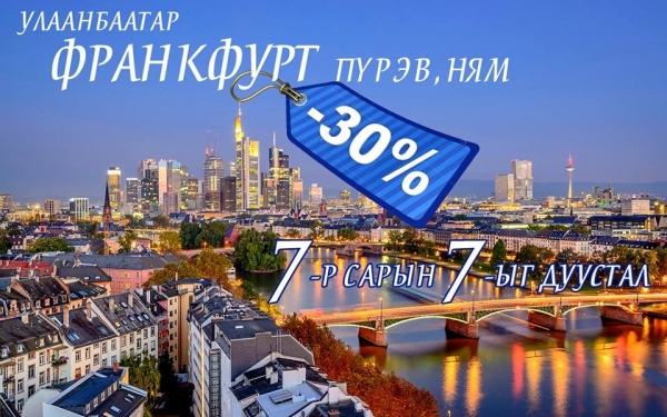 Дашрамд дурдахад, МИАТ ТӨХК Улаанбаатар - Франкфурт чиглэлийн нислэгэндээ 30 хувийн хямдрал зарласан байна. Энэхүү хямдрал нь 7-р сарын 7-ны өдрийг дуустал үргэлжлэх бөгөөд Улаанбаатар - Франкфурт чиглэлд нэг болон хоёр талдаа аялахдаа эдлэх боломжтой юм байна.