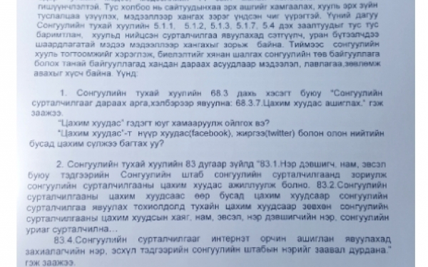 Сонгуулийн албан ёсны сурталчилаа эхлэхэд хоёрхон долоо хоног үлдээд байхад Сонгуулийн хуультай холбоотой зарим нэг асуудал тодорхойгүй, бүрхэг хэвээр байна. Ялангуяа орчин үеийн мэдээ мэдээлэл түгээх, солилцох хамгийн хүчтэй хэрэгсэл болсон мэдээллийн сайт болон цахим орчинтой холбоотой зохицуулалтыг тодорхойгүй үлдээснээс энэ хоосон орон зайг яаж ч ашиглаж болохоор байдал үүсээд байна. Сонгуулийн тухай хуулийн 68.3 дахь хэсэгт буюу 68.3.7-д цахим хуудас ашиглах хэмээн заасан. Гэтэл үүнд юуг хамааруулж ойлгох, мэдээлэлийн сайтууд багтсан эсэх, нүүр хуудас буюу facebook, жиргээ буюу twitter зэрэг олон нийтийн бусад цахим сүлжээг цахим хуудас гэж ойлгох эсэх нь тодорхойгүй байгаа юм.