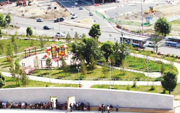 “Дөрвөн жилийн өмнө бид энэ цэцэрлэгт хүрээлэнгийн зураг төслийг гаргасан. Орон сууцны гаднах талбайн 40 орчим хувь нь ногоон байгууламж байх ёстой” гэж “Кон-Инженерс” ХХК-ийн захирал Б.Онх ярив. Усан оргилуурын дундах цэнхэр даашинзтай гүнжийн барималд хүмүүс нүд унагаж байсан ч тэрбээр “Энэ баримлын хийц, материал нь тааруухан. Уг нь мөлгөр гадаргуутай бол эдэлгээ удаан байдаг” гэв.