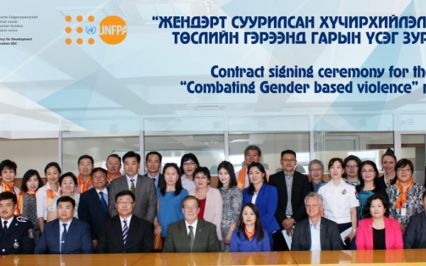 Ulaanbaatar, Mongolia - In a ceremony of signing the contributions agreement today, the Swiss Agency for Development and Cooperation (SDC) formalized a partnership with the United Nations Population Fund (UNFPA) to co-finance the project, "Combating Gender-Based Violence in Mongolia".SDC has committed tocontributing 4.3 million USD to the project, covering a 4 year duration, while UNFPA is financially contributing 853,000 USD, and the Government with in-kind contributions in the amount of 452,000 USD, bringing to the total project budget of around 5.6 million USD.