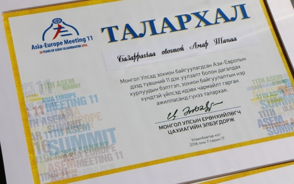 Монгол Улсад болсон Ази, Европын дээд түвшний 11 дүгээр уулзалтыг зохион байгуулахад идэвхи зүтгэл, санаачлага гарган ажилласан байцаагч нарынхаа хөдөлмөрийг үнэлж МХЕГ-т өнөөдөр салбарын хүндэт тэмдэг, шагнал гардуулах ёслолын ажиллагаа боллоо. Уг ёслолын арга хэмжээг нээж хэлсэн үгэндээ МХЕГ-ын дарга Ц.Шаравдорж “Монгол Улсад АСЕМ-ын дээд түвшний чуулга уулзалтыг зохион байгуулахад Мэргэжлийн хяналтын байгууллага төрийн өмнө хүлээсэн үүргээ нэр төртэй биелүүлсэнд баяр хүргэж байна. Олон улс, дэлхийн хэмжээний арга хэмжээг зохион байгуулахад та бүхэн идэвх зүтгэлтэй зарим үед нойр хоолгүй байсан ч нэгэн сэтгэлээр ажилласныг Монгол Улсын Ерөнхийлөгч, төр засгийн удирдлагууд онцгойлон тэмдэглэж байсныг дурдахад таатай байна” хэмээн онцлон тэмдэглэсэн юм.