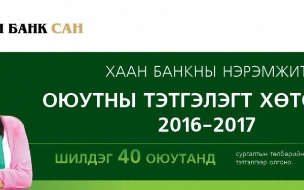 “ХААН Банкны нэрэмжит оюутны тэтгэлэгт хөтөлбөр”-ийн 2,3,4–р курсын оюутнуудын дунд зарлагдаж буй уг тэтгэлэгт хөтөлбөрт Монгол Улсын магадлан итгэмжлэгдсэн их, дээд сургуулийн бакалаврын зэргийн 2,3,4–р курсын оюутнуудаас шалгаруулж шилдэг 40 оюутанд сургалтын төлбөрийн тодорхой хувийг тэтгэлгээр олгоно.