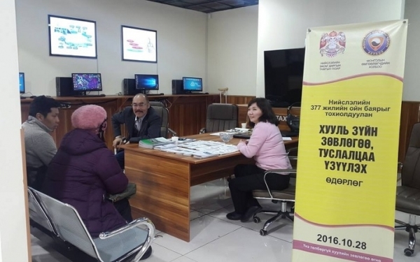 Нийслэлийн 377 жилийн ойн өдрийг тохиолдлуулан Нийслэлийн Засаг даргын Тамгын газар, Монголын Өмгөөлөгчдийн Холбоотой хамтран нийслэлийн үйлчилгээний Дүнжингарав, Мишээл, Драгон төвүүдэд үнэ төлбөргүй хууль, эрх зүйн зөвлөгөө, туслалцаа үзүүлэх өдөрлөг зохион байгууллаа.