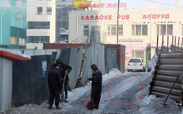 Талийгаачийн халтирч унасан газар цас, мөсөнд дарагдаж, гөлийгөөд удаж буй аж. Хоёр талд нь хашаа барьснаас хойш эзэнгүйндэж, хог, ялгадсанд дарагджээ. Тэнд үйлчилгээ эрхэлдэг эмэгтэй “Энэ хоёр хашааг бариад тав орчим жил болж байна. Хэзээ барилга барих юм, бүү мэд. Нэг хашааг нь хоёрдогч түүхий эд авах цэг, нөгөөг нь автомашины зогсоол хэлбэрээр ашигладаг юм.