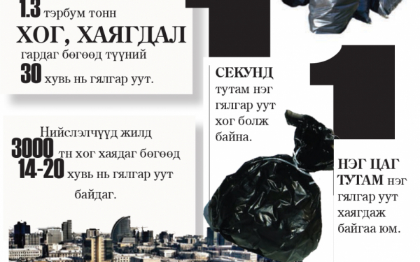 Нийслэлийн Байгаль орчны газар, “Технож бит” төрийн бус байгууллага, Финландын ФЛОМ байгууллагын төлөөлөгчийн газар хамтран “Гялгар уутнаас татгалзах өдөр” төсөл санаачилж, уриалга гаргалаа. Улаанбаатар хотын 380 мянган өрх өдөрт тус бүр нэг гялгар уут худалдан авч хэрэглэдэг гэвэл багадаа 38 сая төгрөгийг үүнд зарцуулдаг гэж болно. Гэтэл манай улс хаягдлаа дахин боловсруулдаггүй, хөрсөнд булдаг. Ингэснээр гялгар уут хөрсөнд 100-500 жил байж, ялзрахдаа химийн хортой бодис, хий ялгаруулж, амьтан, ургамлыг өвчлүүлдэг нь батлагдаад байгаа.