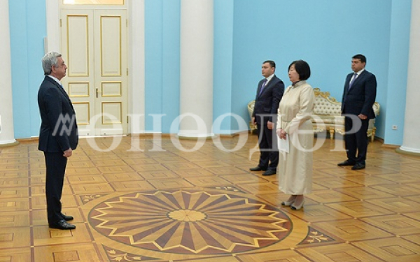 Монгол Улсаас Бүгд Найрамдах Армян Улсад хавсран суух Онц бөгөөд Бүрэн эрхт Элчин сайд Б.Дэлгэрмаа Бүгд Найрамдах Армян Улсын Ерөнхийлөгч С.А.Саргсянд Итгэмжлэх жуух бичгээ өргөн барив.