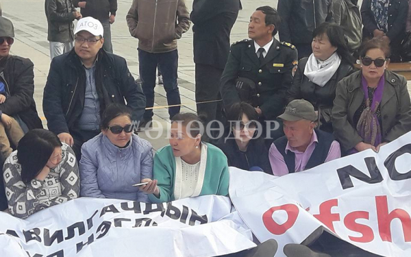 “Ард түмний онц түр зөвлөл” төрийн бус байгууллагаас зохион байгуулсан “Хуулиа дээдэлье, оффшорчдыг шалга” жагсаал, цуглааны дараах суулт эхэлж, хүйтэн, нойтон цементэн талбай дээр хөгшид, залуус холилдсон хэдэн хүн хоёр хонов.