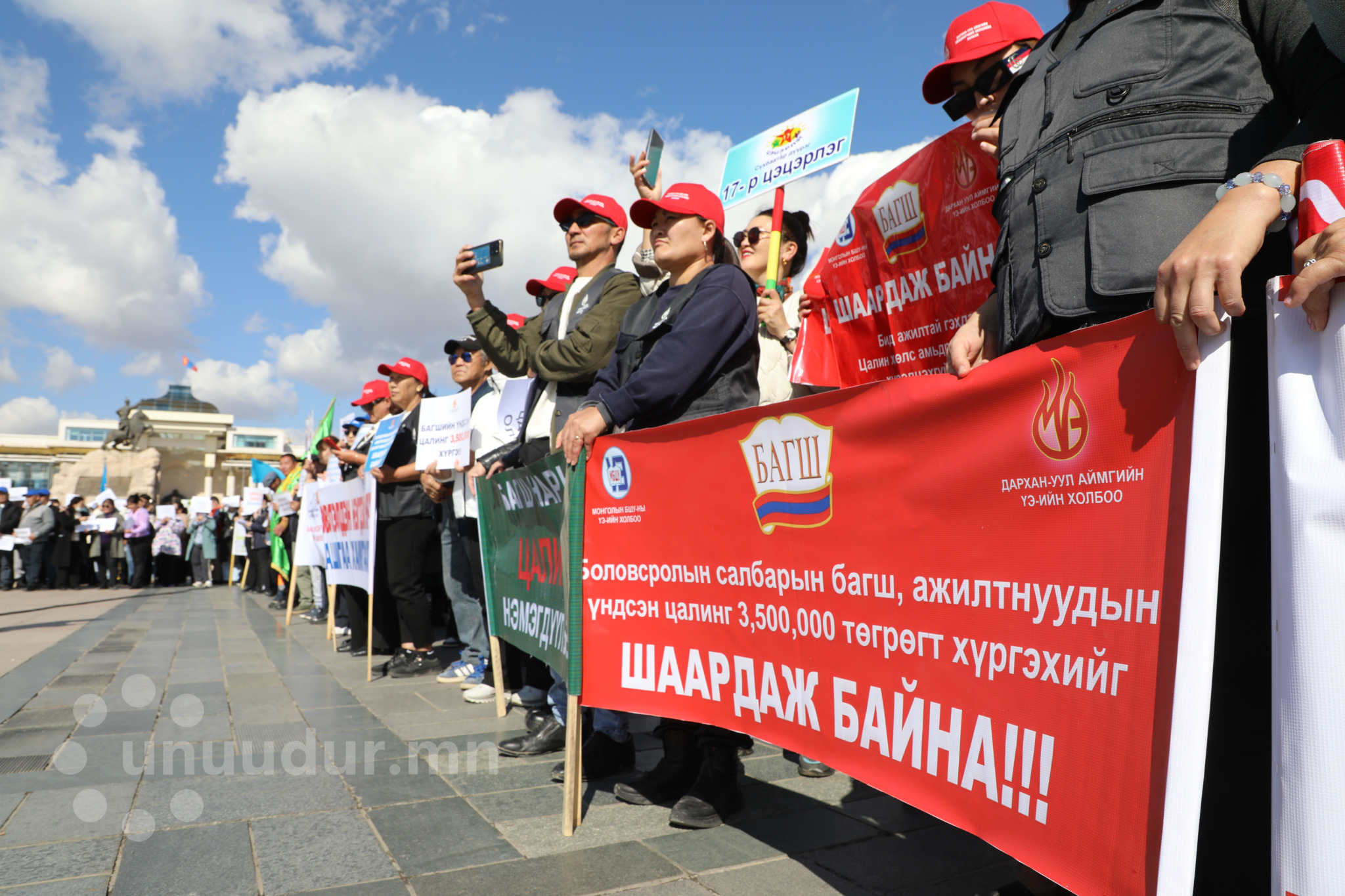 Монголын боловсрол, шинжлэх ухааны үйлдвэрчний эвлэлийн холбооноос багш нарын үндсэн цалинг 3.5 сая төгрөгт хүргэхийг шаардаж, Төв талбайд өчиг¬дөр жагсаал зохион байгууллаа. Эл холбооныхон багш нарын цалинг 50 хувиар нэмэгдүүлэх саналаа Боловсролын яам болон Засгийн газарт өнгөрсөн сард хүргүүлсэн ч төдийлөн шийдэлд хүрч чадаагүй байна. Улмаар энэхүү жагсаалыг зохион байгуулсан бөгөөд асуудлыг нь шийдэхгүй бол өлсгөлөн зарлахаа энэ үеэр илэрхийллээ. Жагсаалд зөвхөн нийслэлийн бус, орон нутгийн ерөнхий боловсролын болон цэцэрлэгийн багш нар оролцсон нь эл асуудал хэр хурцадсаныг харуулж буй юм.