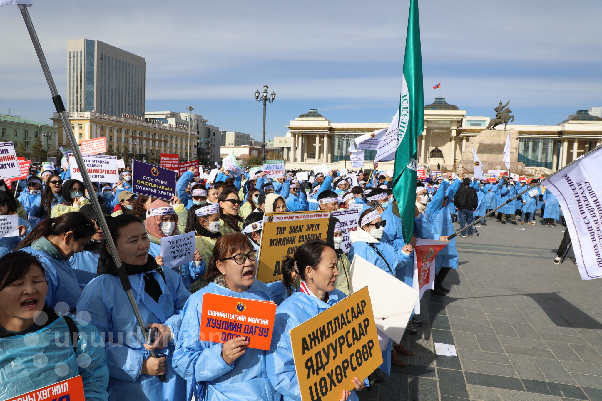 Цалингаа нэмүүлэхийг шаардсан багш нарын жагсаалд эмч нар нэгдлээ. Тэд ч мөн цалингаа 3.5 сая төгрөгт хүргэхийг шаардаж, үгүй бол ажил хаяна гэдгээ илэрхийлж байна. Тодруулбал, эмч, ажилтнуудын үндсэн цалинг нэмэхийг шаардсан “Эрүүл мэндийн салбарын зөв шинэчлэлийн төлөө” уриатай жагсаал, цуглаан Сүхбаатарын талбайд өчигдөр 10.30-15.00 цагт болов. Монголын эрүүл мэндийн ажилтны үйлдвэрчний эвлэлийн холбооноос уг жагсаалыг зохион байгуулсан бөгөөд өрх, сум, аймаг, дүүрэг, улсын төрөлжсөн мэргэжлийн эмнэлгийн эмч, ажилтнууд нэгдсэн юм. Нийслэл төдийгүй 21 аймаг, сумдад энэхүү жагсаал зэрэг болжээ.